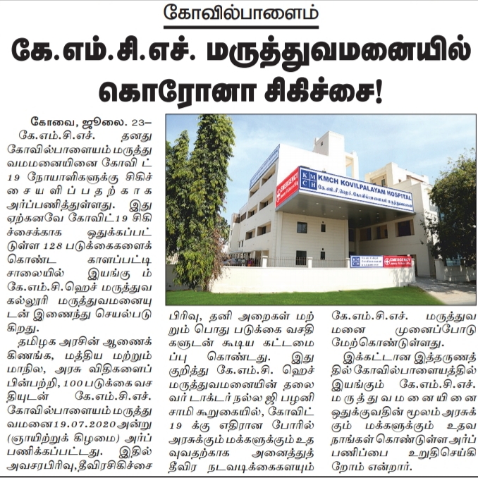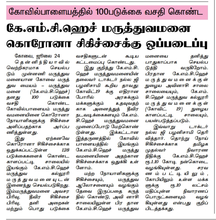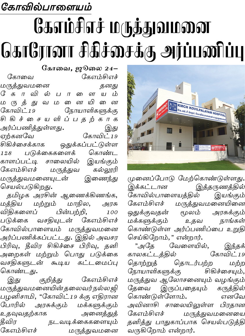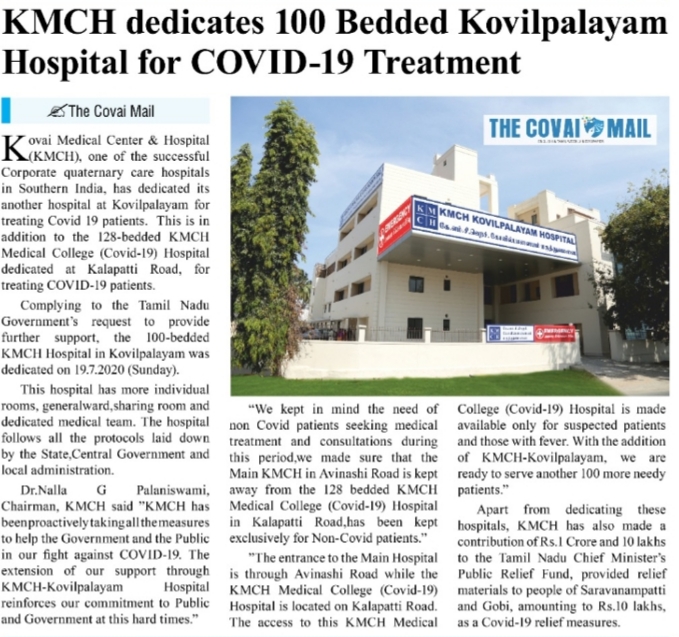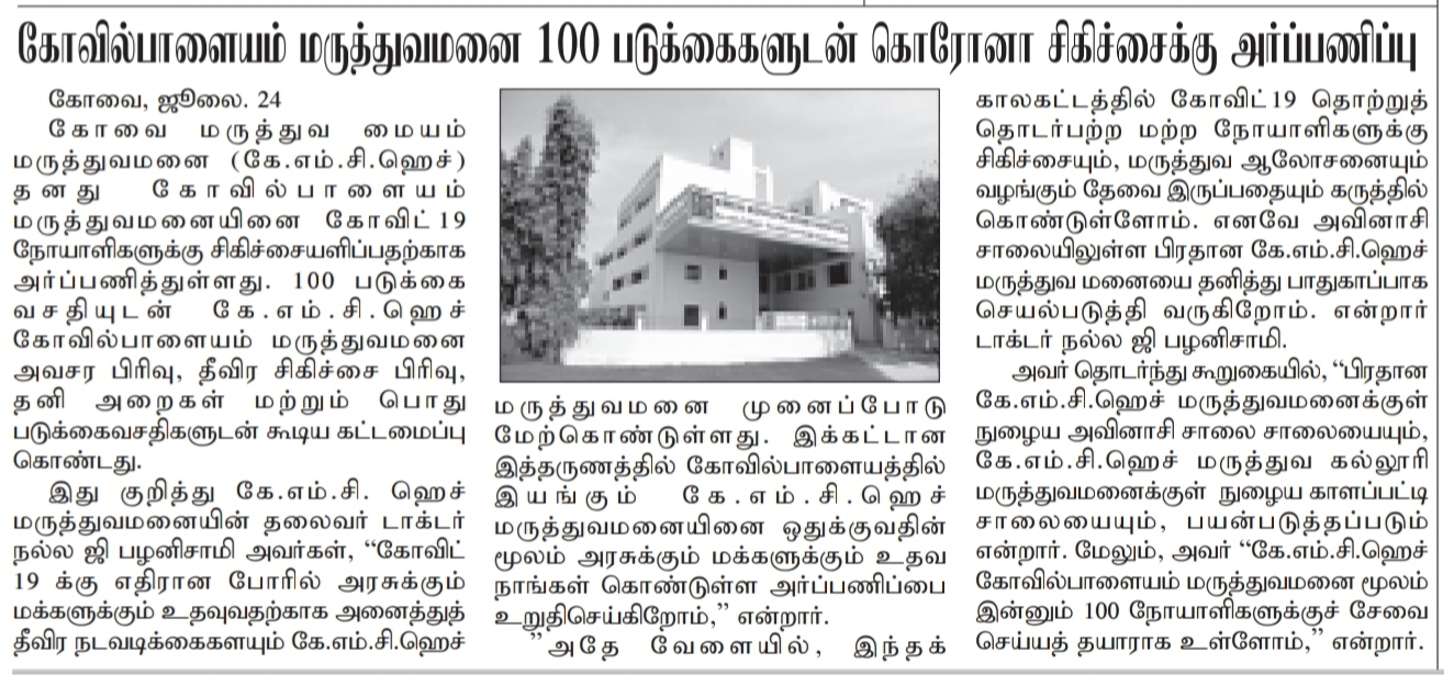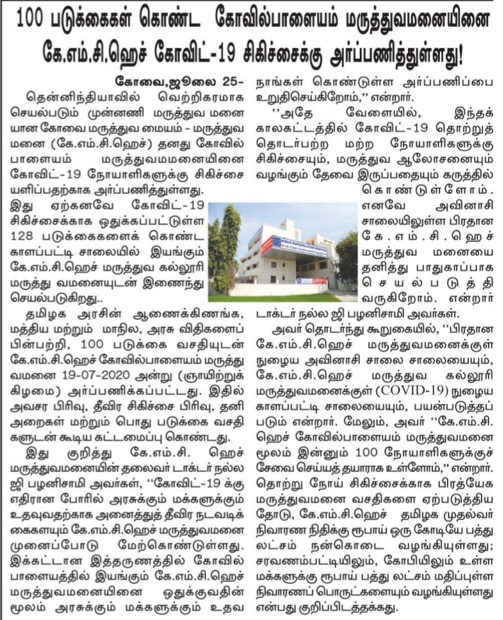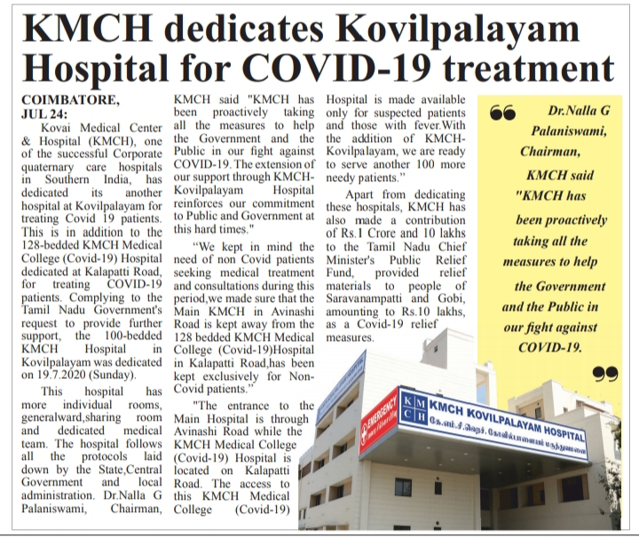 Press Clippings of “KMCH dedicates Kovilpalayam Hospital for COVID-19 treatment” appeared in the following news journals.
