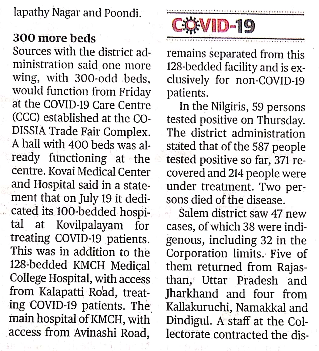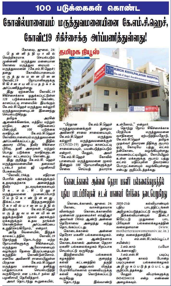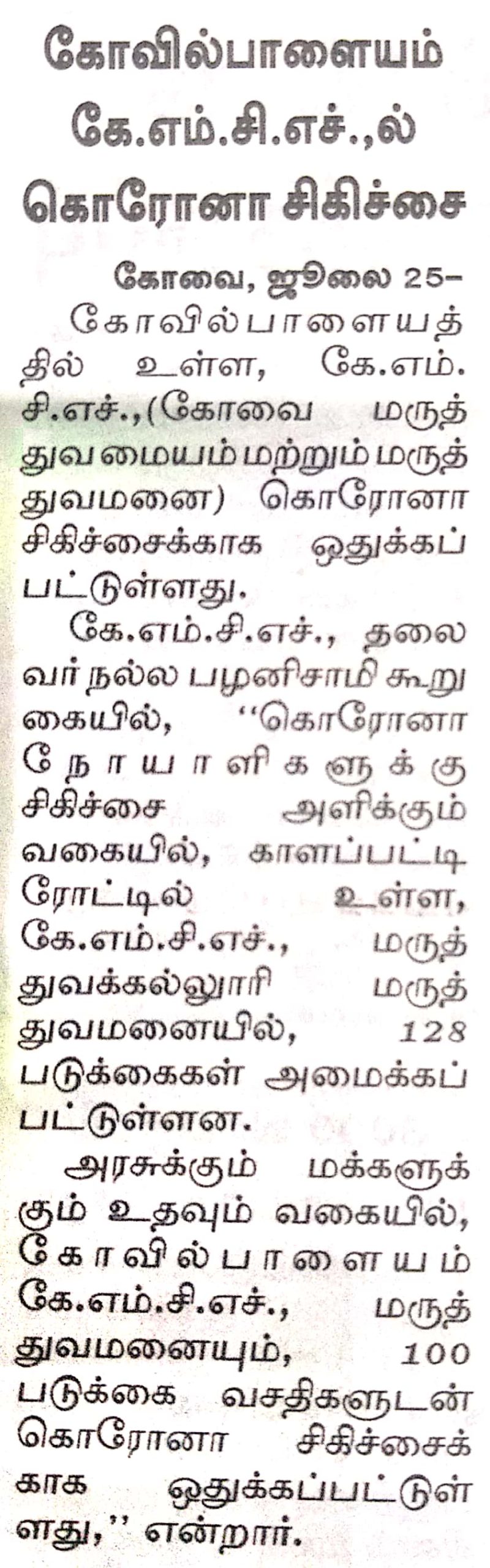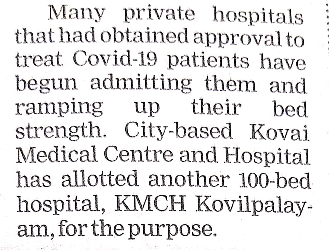 Press Clippings of “KMCH dedicates Kovilpalayam Hospital for COVID-19 treatment” appeared in the following news journals.