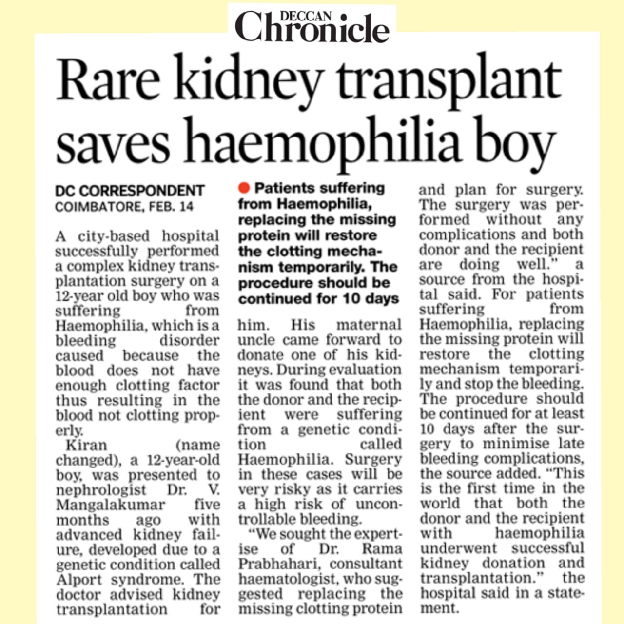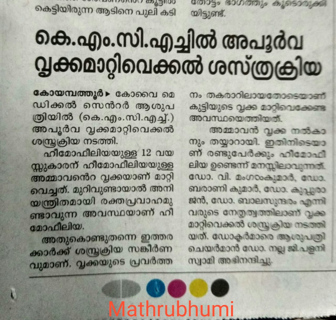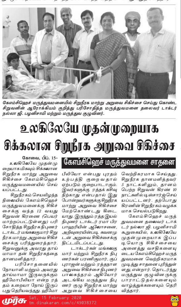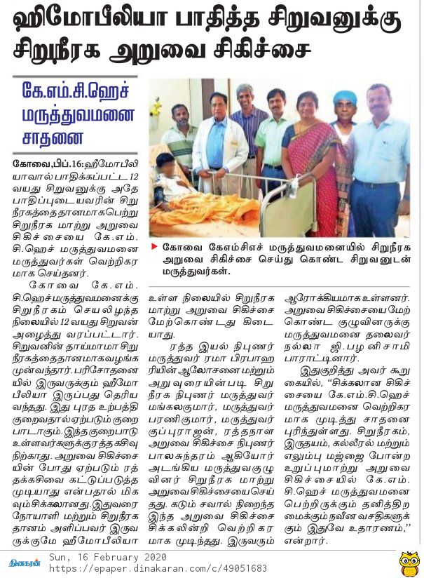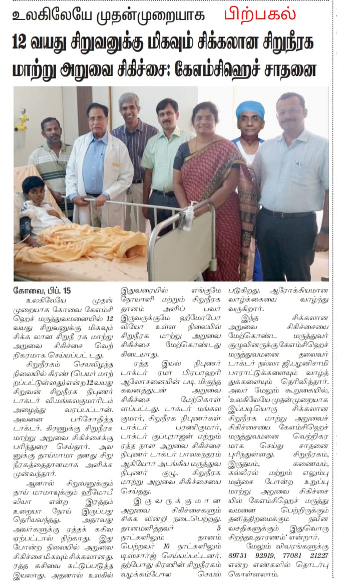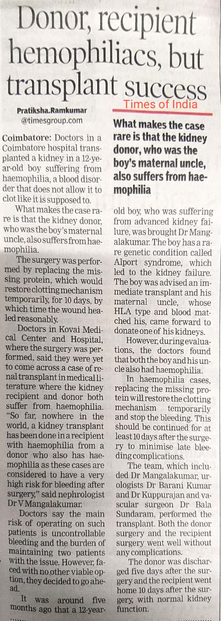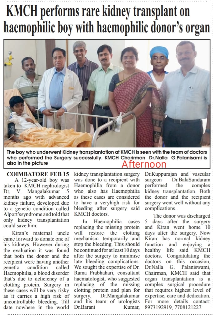 Home » KMCH Performs Rare Kidney Transplant On Haemophilic Boy With Haemophilic Donor’s Organ
