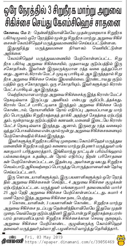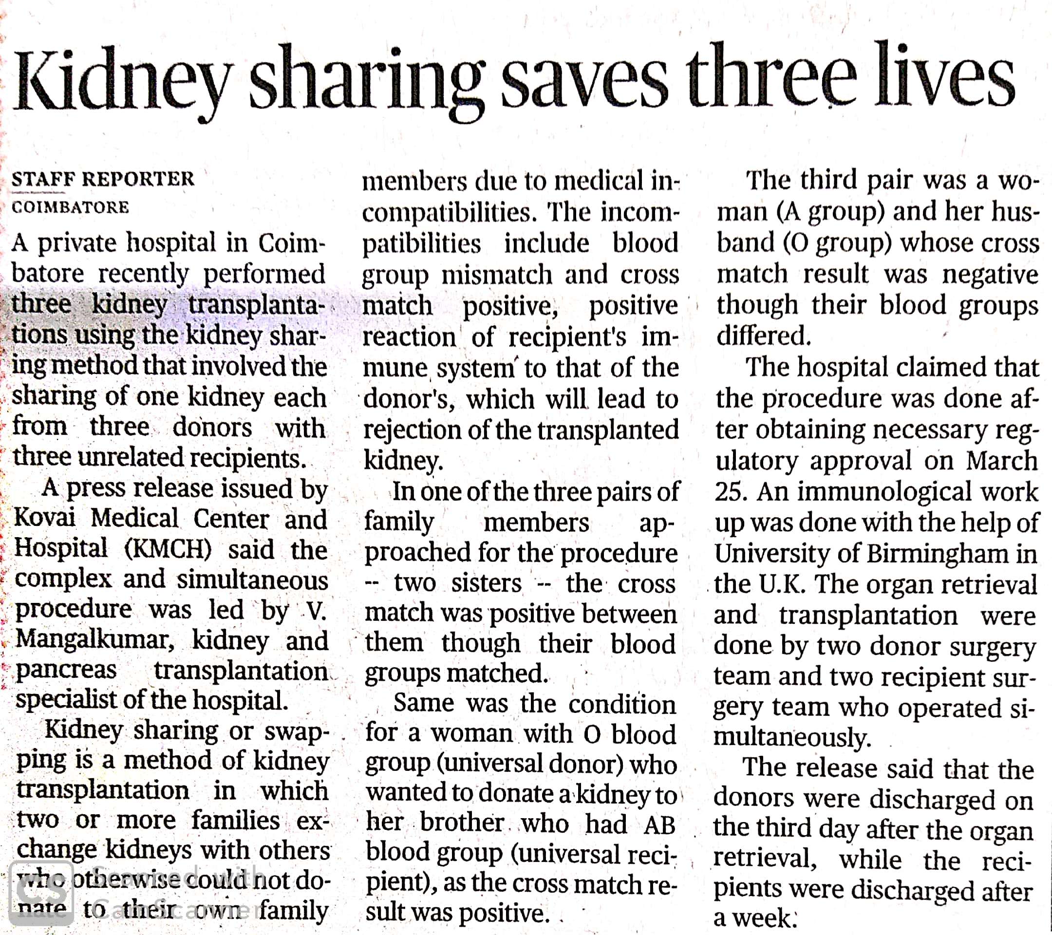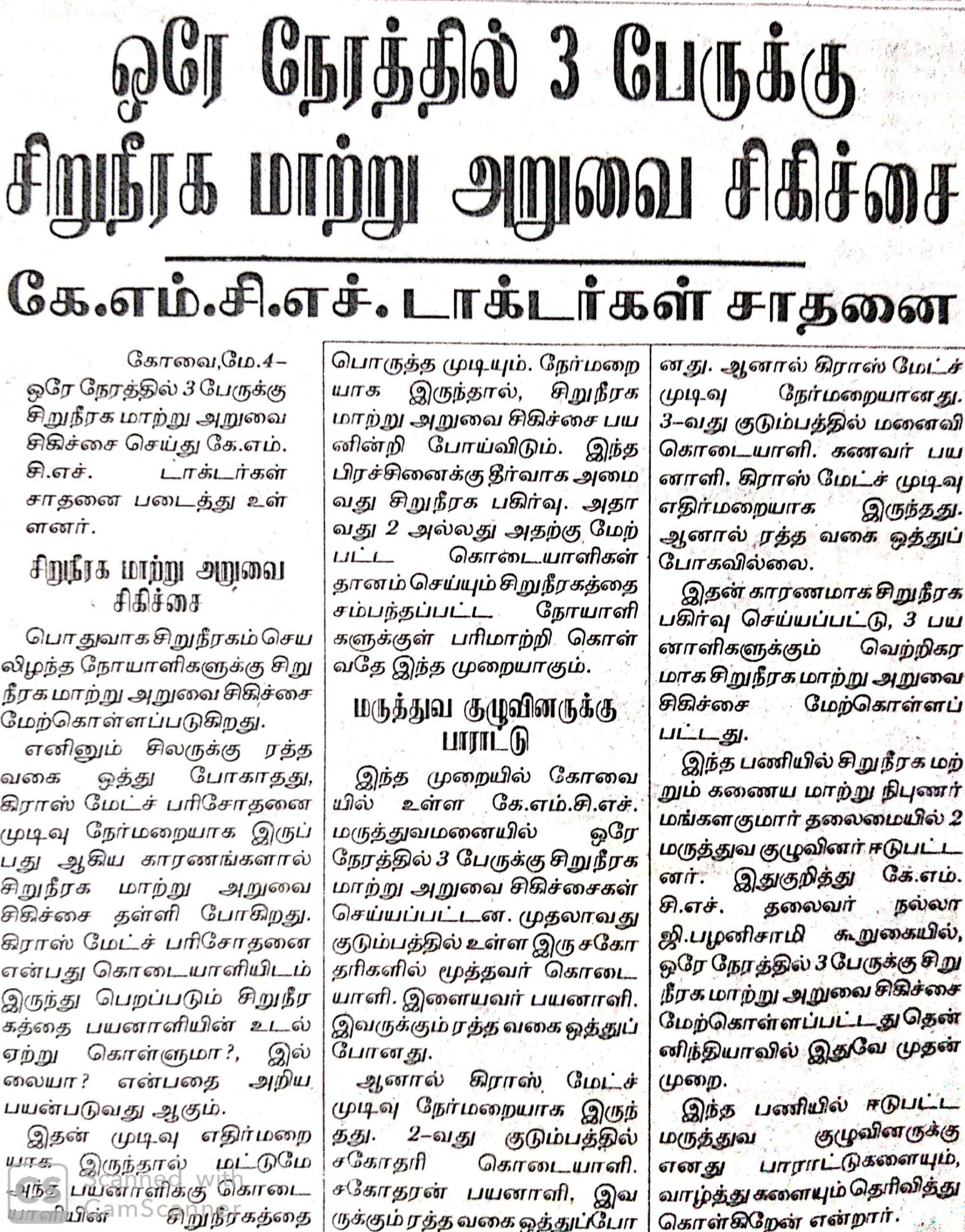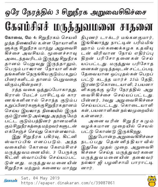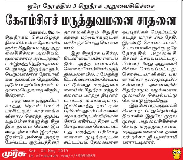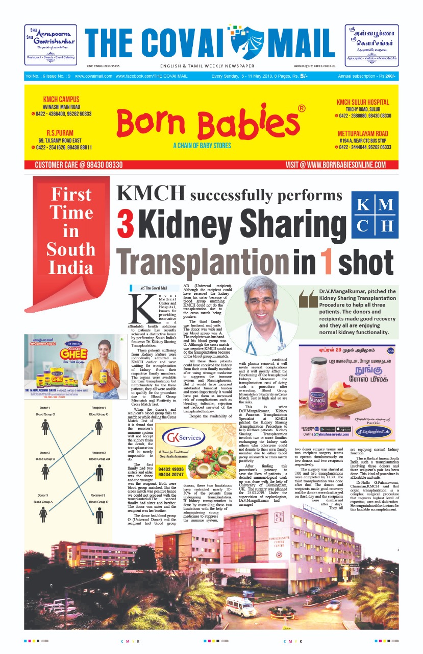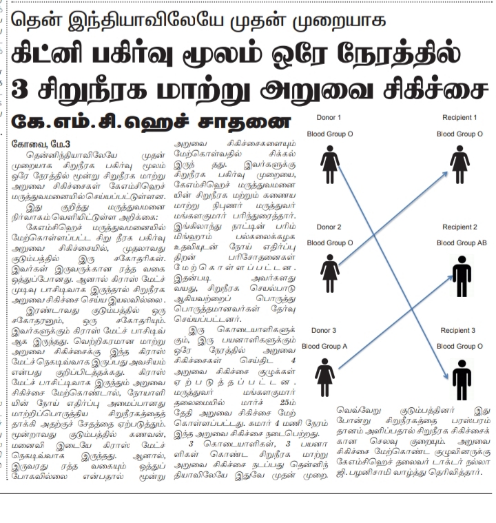 Press Clippings of “Simultaneous three kidney transplant performed by KMCH” appeared in the following news journals.