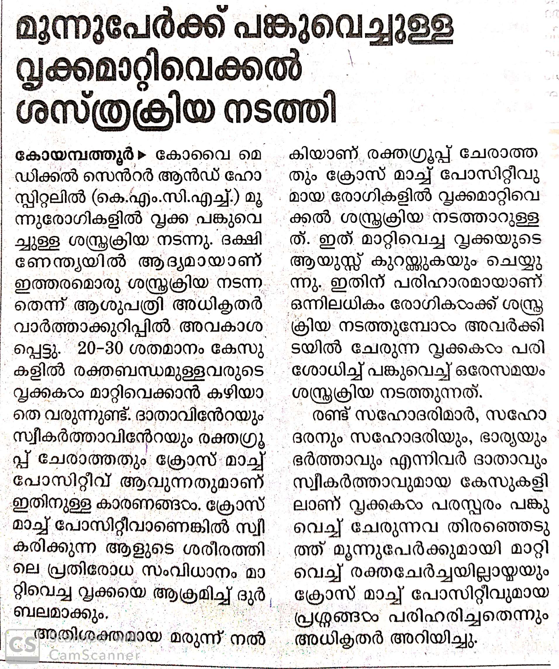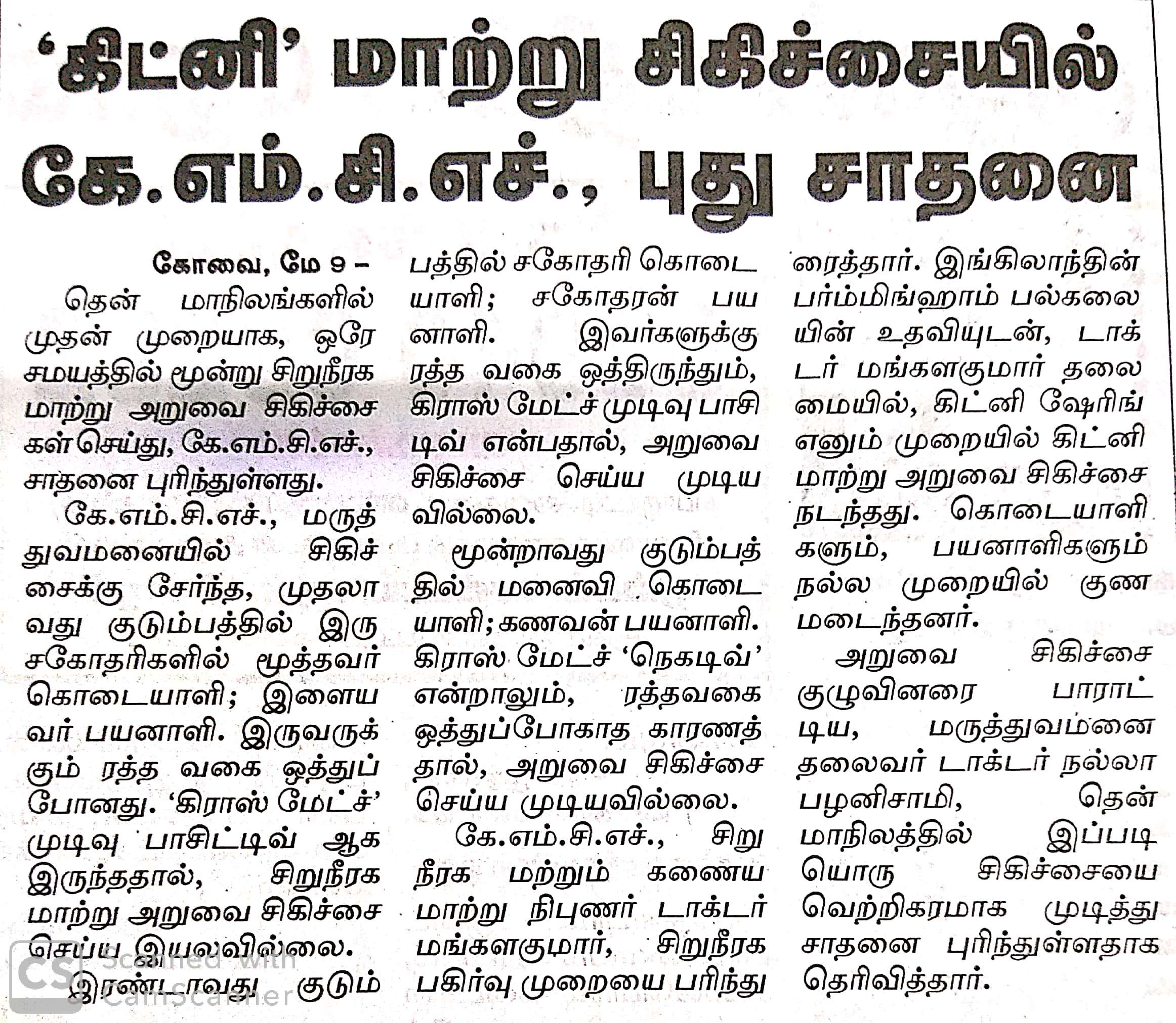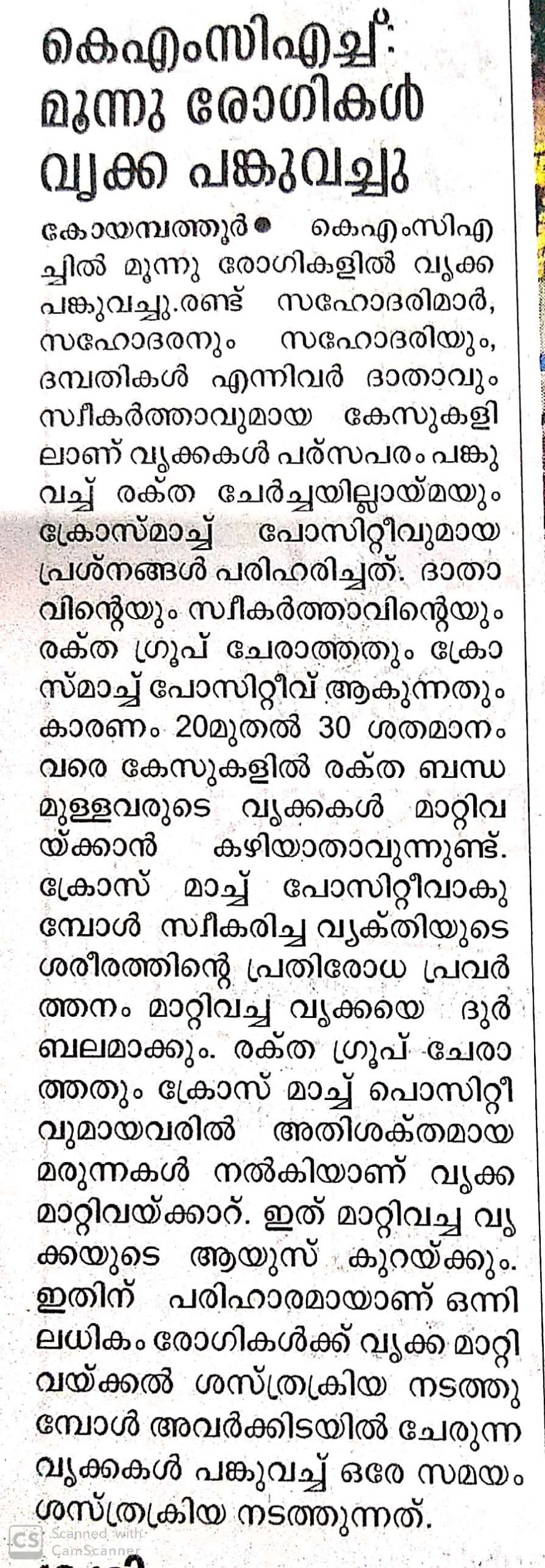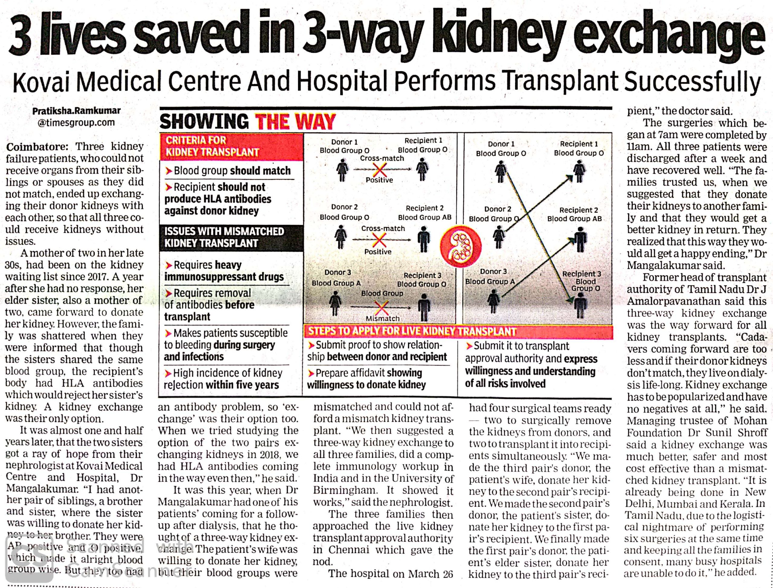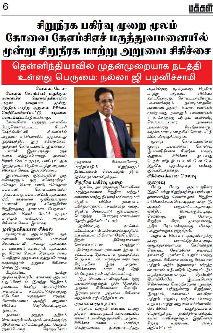 Press Clippings of “Simultaneous three kidney transplant performed by KMCH” appeared in the following news journals.